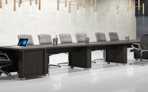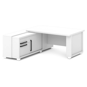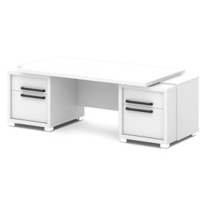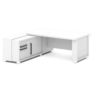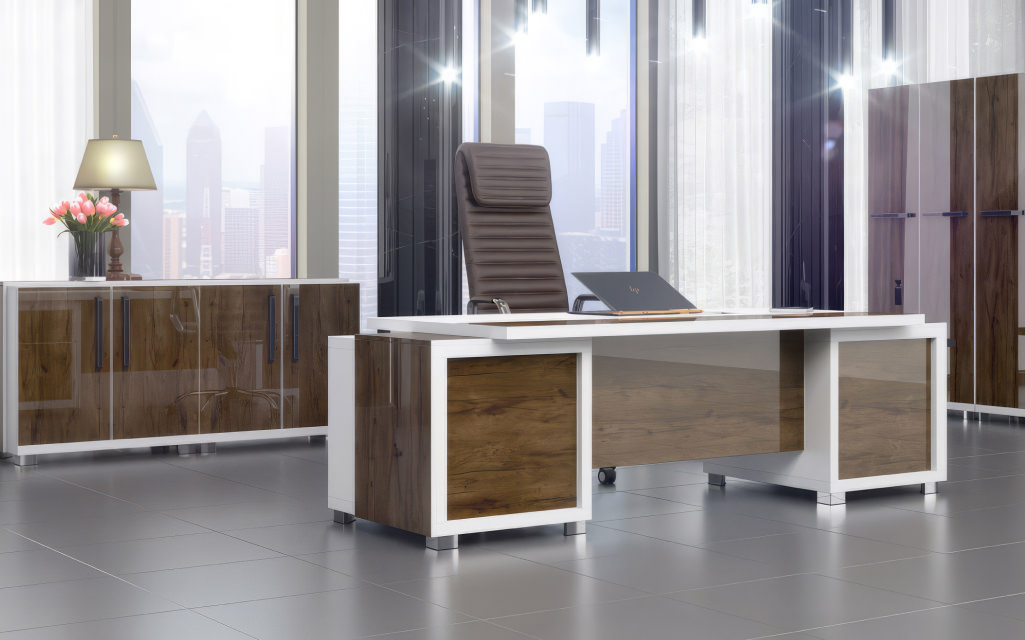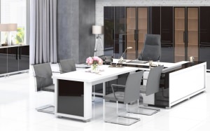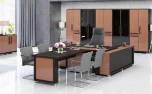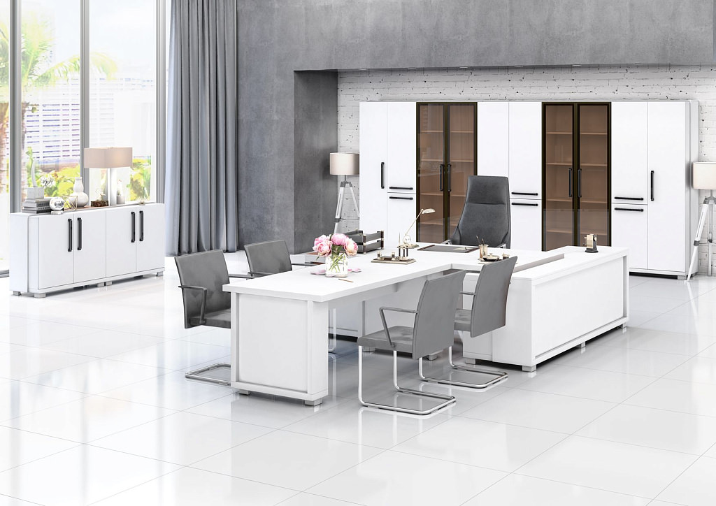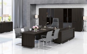 Многообразие элементов впечатляет: столы руководителя с интегрированными тумбами, брифинг-приставки, журнальные и переговорные модели, шкафы различной высоты. Матовое стекло в сочетании с толстостенной ЛДСП создает гармоничный облик без лишних деталей. Каждый компонент – продуманное воплощение баланса между эстетикой, комфортом и практичностью.