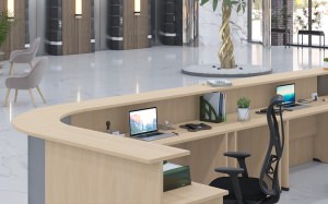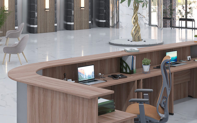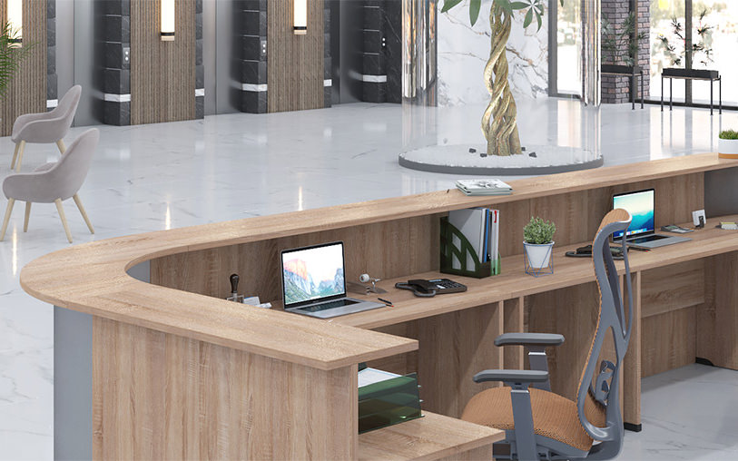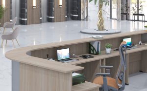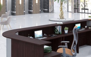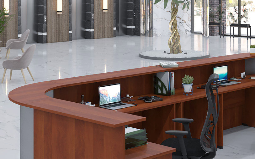 Модульная система Opera создает выразительную композицию приемной зоны, объединяя прямые стойки с радиальными угловыми элементами. Металлические экраны на соединительных модулях придают конструкции премиальный облик, подчеркивая изящные линии и функциональность. Благородные оттенки древесины позволяют адаптировать ресепшен к любой цветовой концепции.