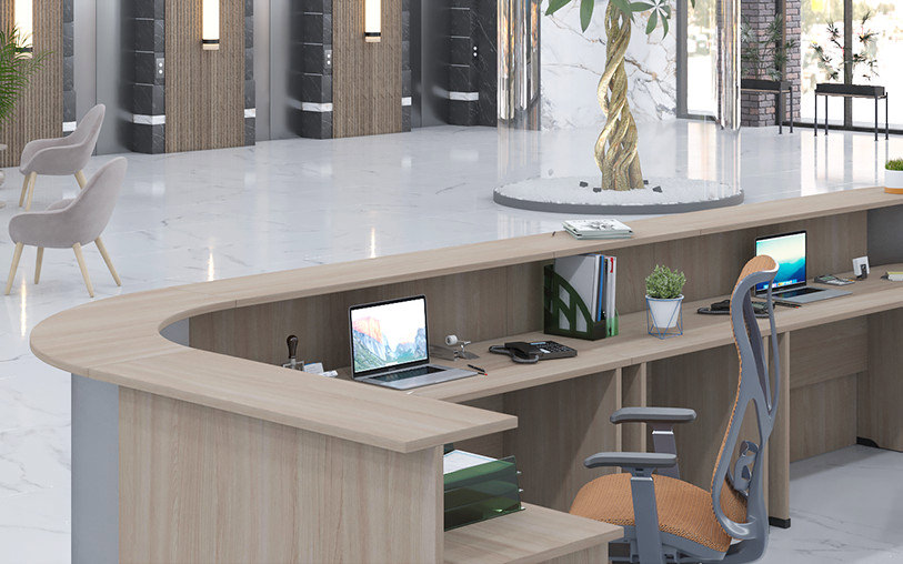 Рабочие поверхности с кромкой ABS 2 мм обеспечивают долговечность при интенсивном использовании. Двухкомпонентная эксцентриковая стяжка гарантирует надежность сборки и стабильность конструкции. Гибкая архитектура позволяет проектировать зоны приема разной конфигурации, оптимизируя пространство и создавая эргономичные рабочие места для персонала.