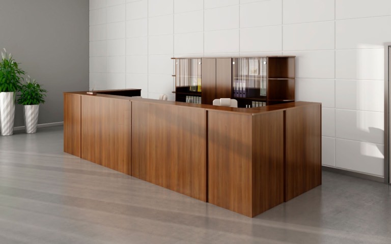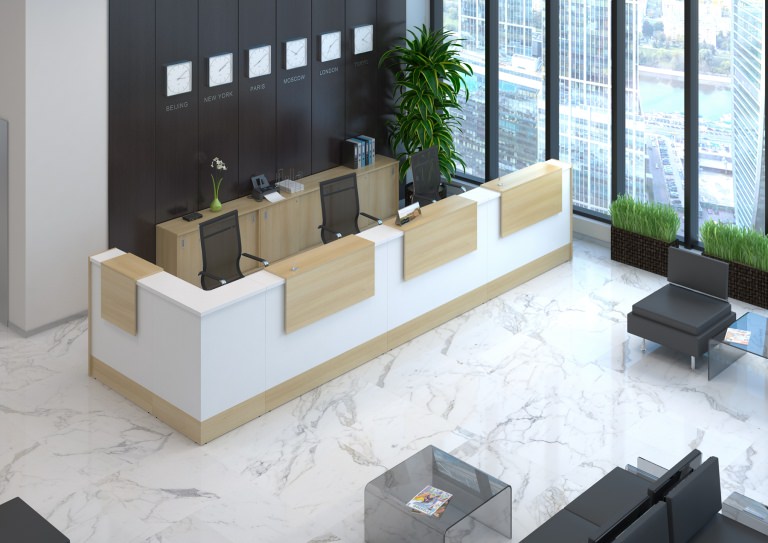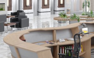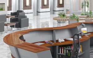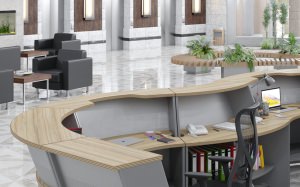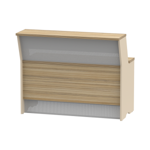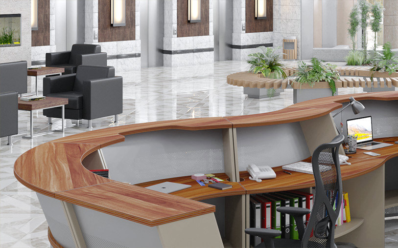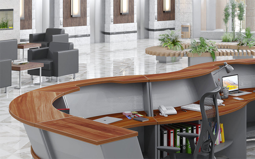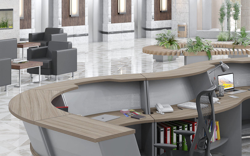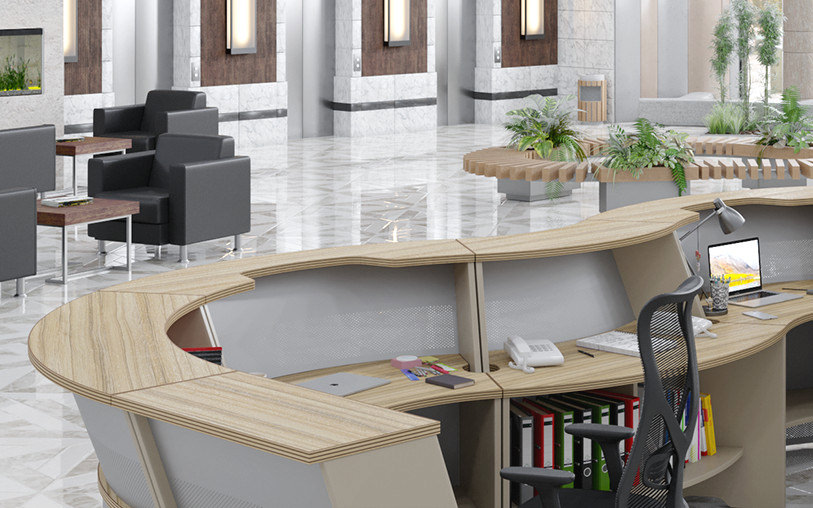 «Berlin ресепшен» – первая точка контакта клиента с компанией, где эстетика и функциональность сливаются в единое целое. Отличительная черта серии – перфорированный металлический фасад, визуально облегчающий конструкцию и создающий эффект открытости. Прямые и радиальные элементы формируют изящные волнообразные композиции, адаптированные под любую планировку холла.